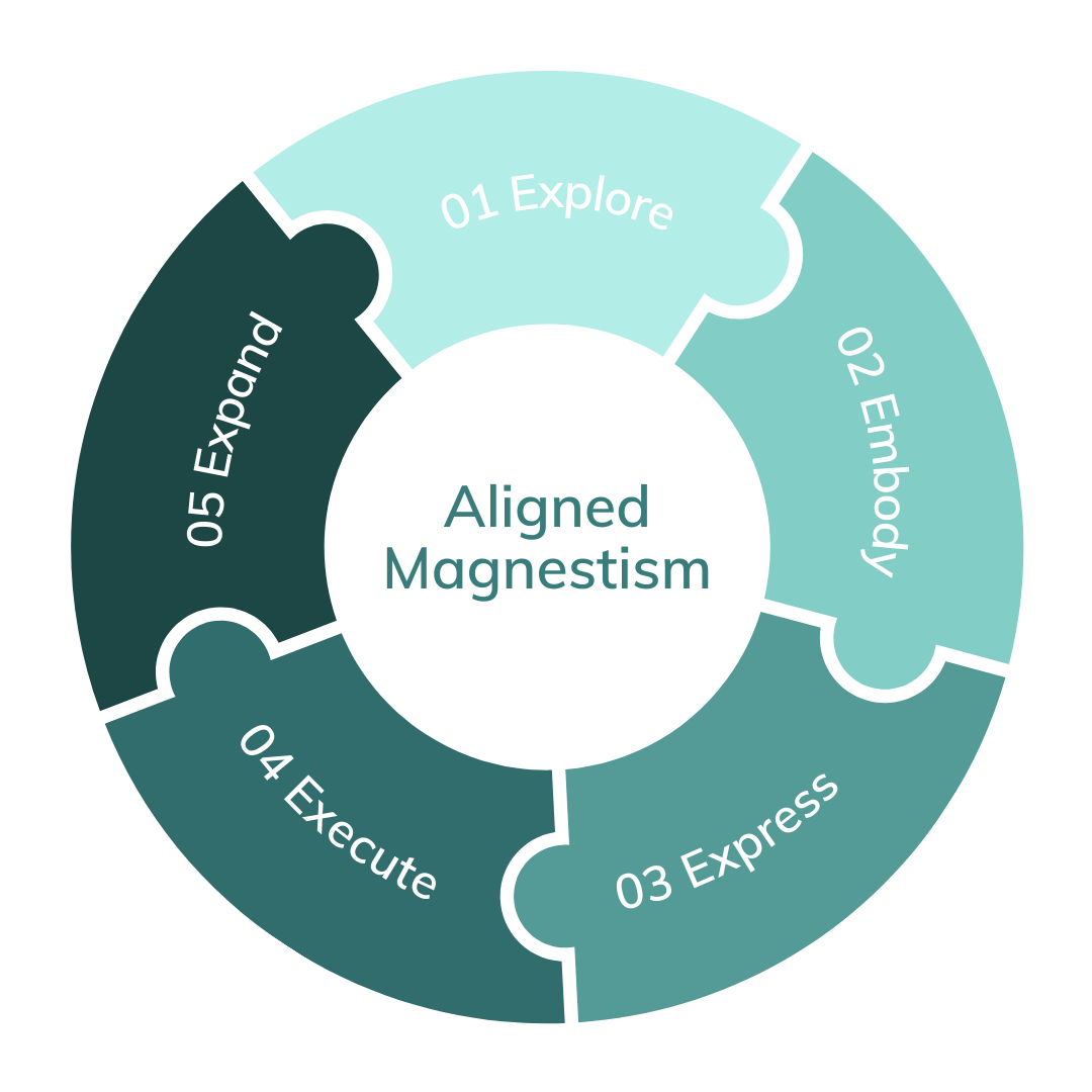 Aligned Magnetism is a five-phase leadership framework designed to build confidence, clarity, executive presence, and sustainable impact, without burnout or self-betrayal. It addresses both the internal drivers of behaviour and the external demands of leadership, helping leaders move from effortful performance into grounded, authentic influence.